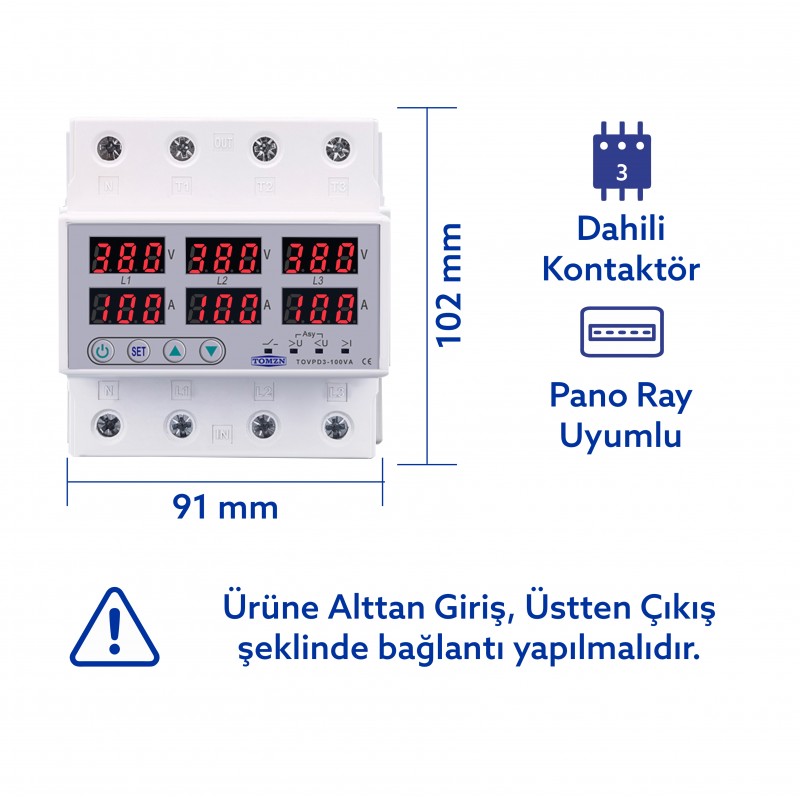 TOMZN Trifaz 380V Gerilim Ve Akım Koruma Rölesi Yüksek Alçak Voltaj Akım Koruma 100A 3 Fazlı Gerilim Koruyucu Röle Sanayi Tipidir. Asansör Motoru vs gibi sistemlerde kullanılabilir. Ev için Uygun değildir. Mikro çip temellidir. ; Voltaj ve Akım gösteren dijital ekran ; Elektrikli cihazlarınızı yüksek/alçak voltaj ve yüksek akıma karşı korur. ; %99 üzerinde voltaj ölçme isabeti ; Butonlarla ayarlanabilir parametreler ; Yüksek alçak akım ve yüksek akım durumlarını gösteren LED’ler. ; Pano Rayına montaj edilebilir.