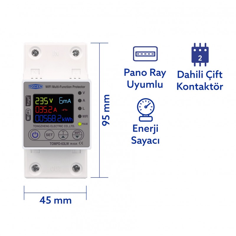 Tomzn Kaçak Akım Koruma Rölesi Ve Yüksek Voltaj Ve Akım Koruyucu Röle 63A Wifi Özellikli Devrim