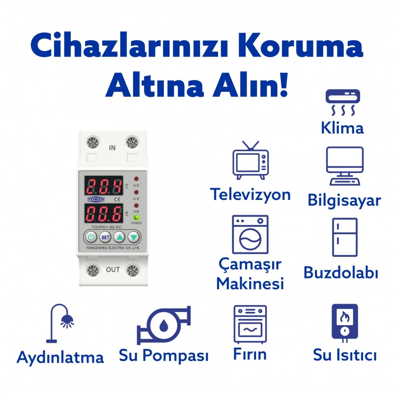 • Tomzn Voltaj ve Akım Koruma Rölesi Yüksek Alçak Gerilim Akım Koruyucu 63A Elektrik Bekçisi