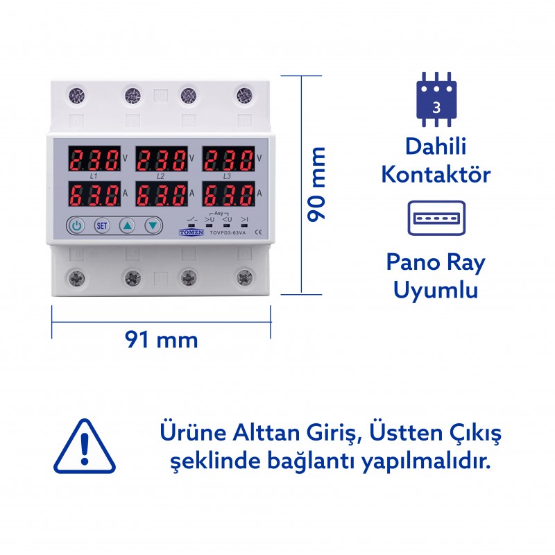 Tomzn Trifaz Gerilim ve Akım Koruma Rölesi Yüksek Alçak Voltaj Koruyucu Röle 63A 3 Fazlı - Ev Tipi