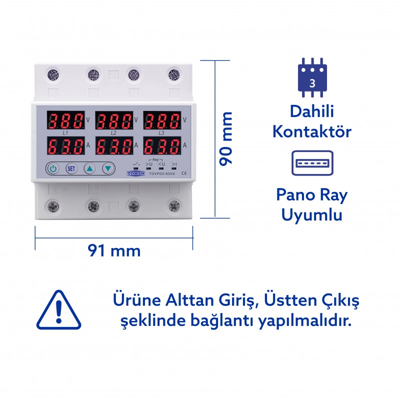 • Tomzn Trifaz Nötrsüz 380V Gerilim Ve Akım Koruma Yüksek Alçak Voltaj Akım Koruma 63A Sanayi Tipi
